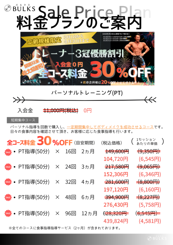 00_お知らせ キャンペーン 2026.03.18 トレーナー優勝3冠割引キャンペーンのお知らせ(開業以来、最大級割引) 2026.03.17 2026年3月18日(火)から2026年4月30日(木)までのご契約で割引を実施致します。 新規のお客様はコース料金30%割引、既存会員様はコース料金20%割引致します。 お申込みは↓こちらから!